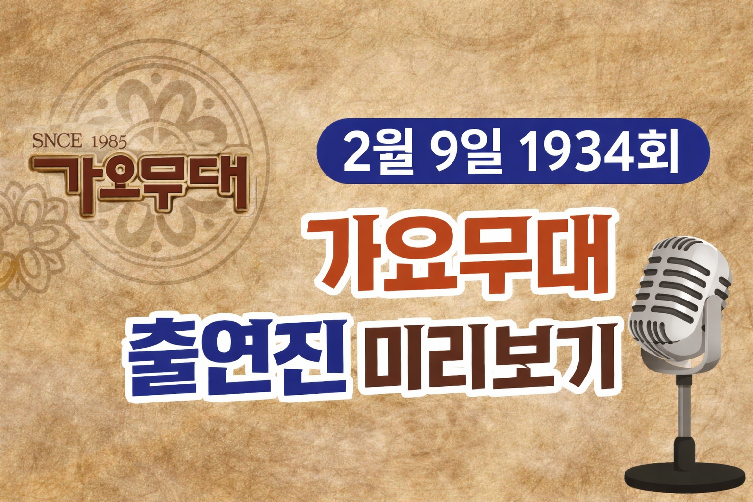 이번 2월 9일 1934회 가요무대 출연진은 이름만 들어도 반가운 가수들이 대거 포진해 있어 방송 전부터 기대감을 높이고 있습니다.