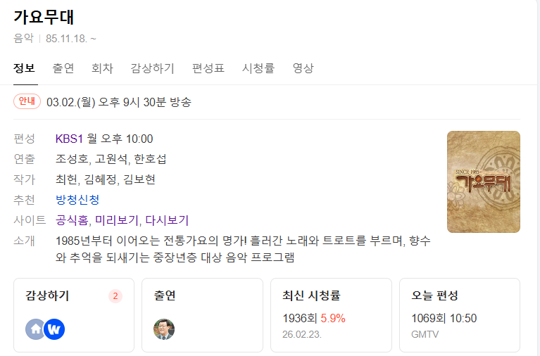3월 2일 가요무대 방송 정보