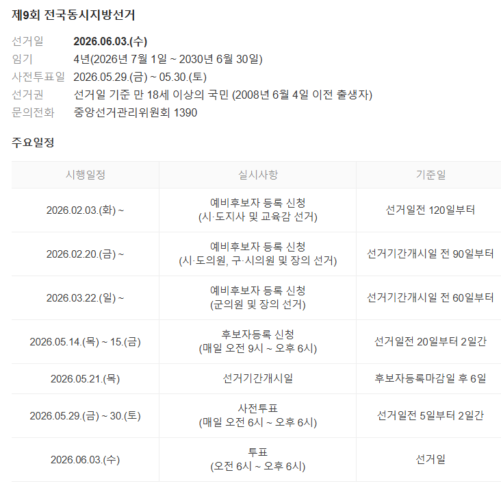 | 2026 지방선거일정 : 지방선거 투표일·사전투표·후보등록 일정 (0) | 2026.02.20 |