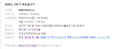 2026년 6월 3일에는 지방선거와 함께 2026 재보궐 선거도 동시에 실시됩니다.특정 지역에서는 국회의원 재·보궐 선거가 함께 진행되기 때문에 해당 유권자는 반드시 일정을 확인해야 합니다.특히